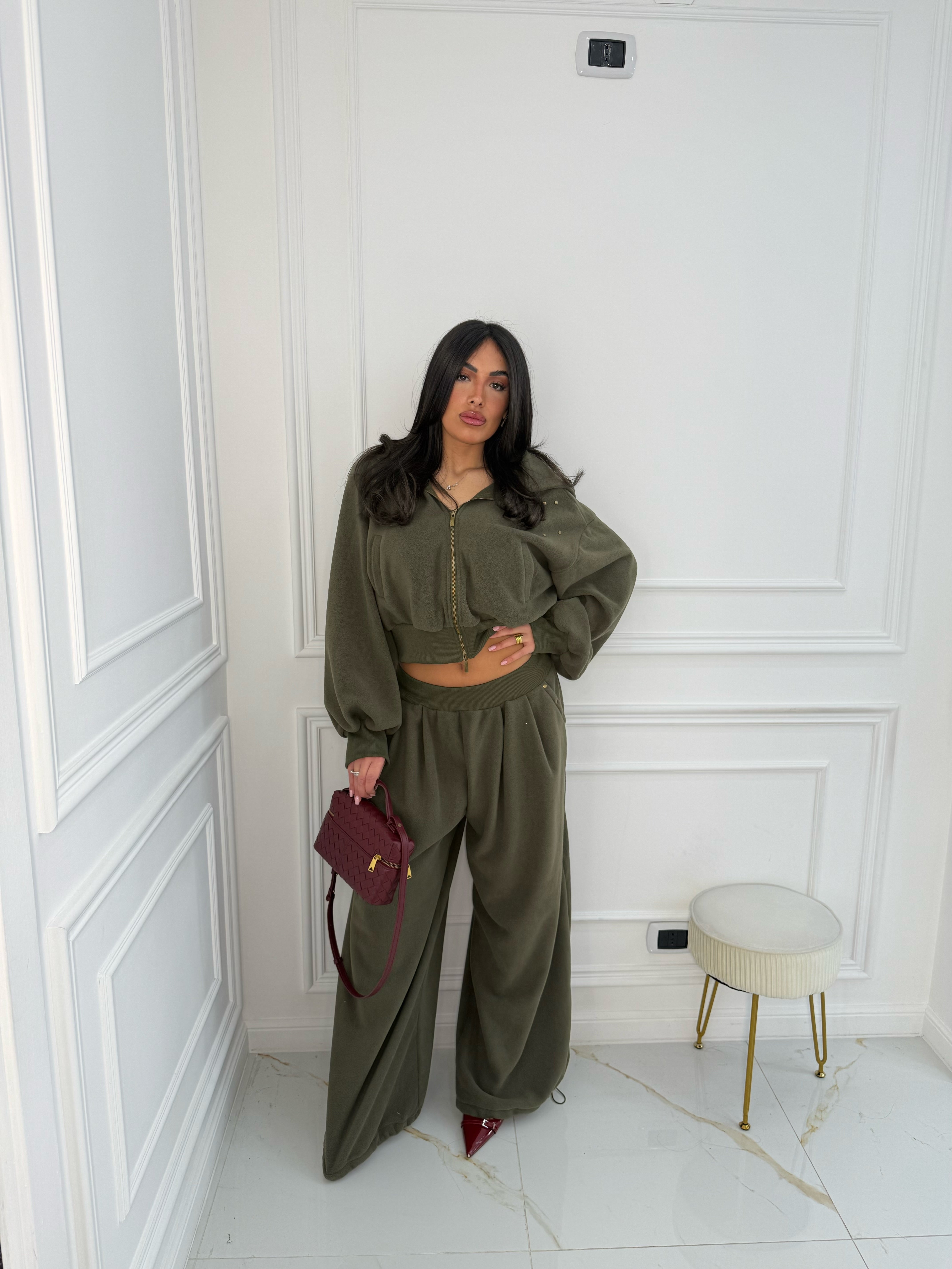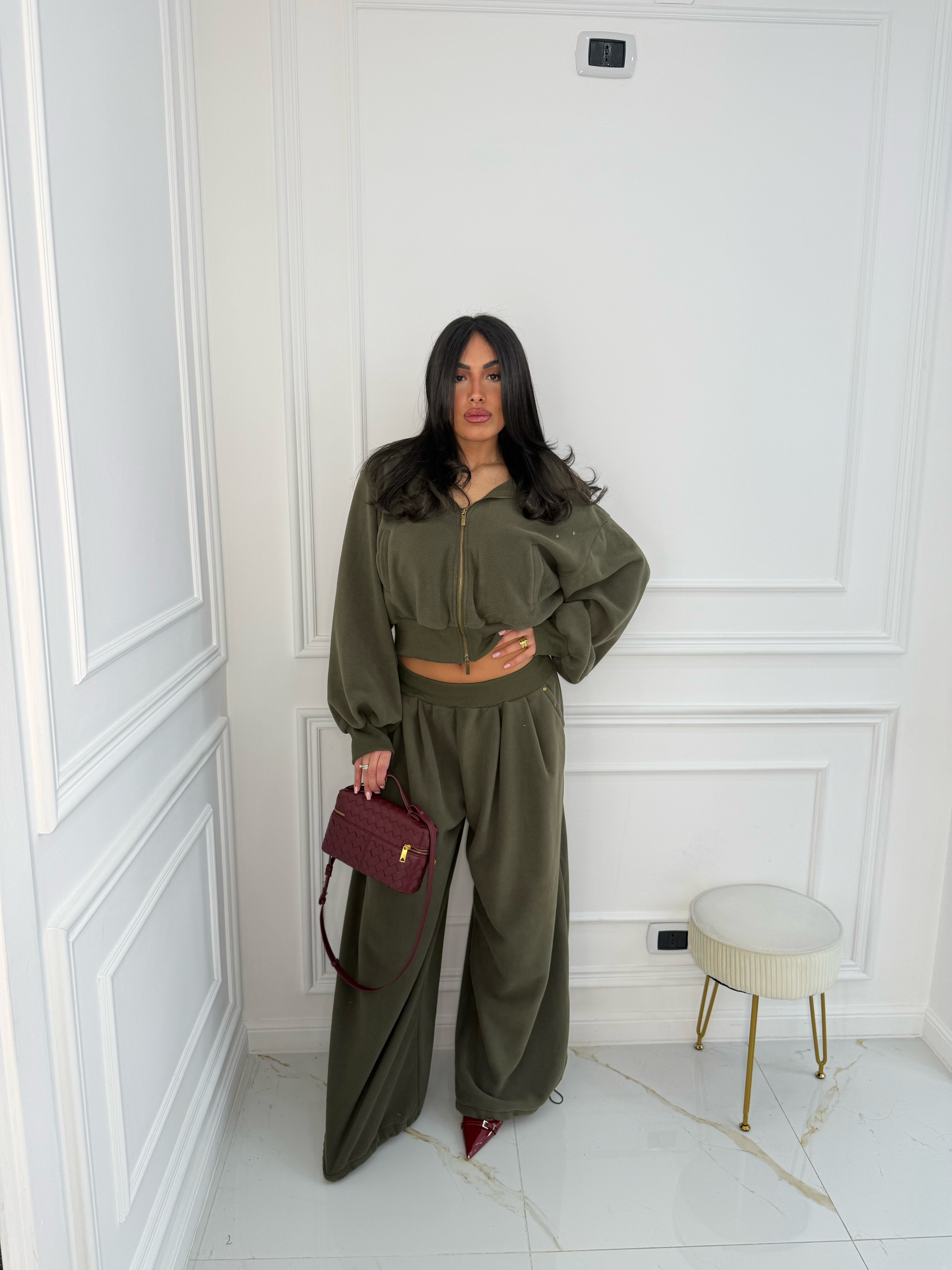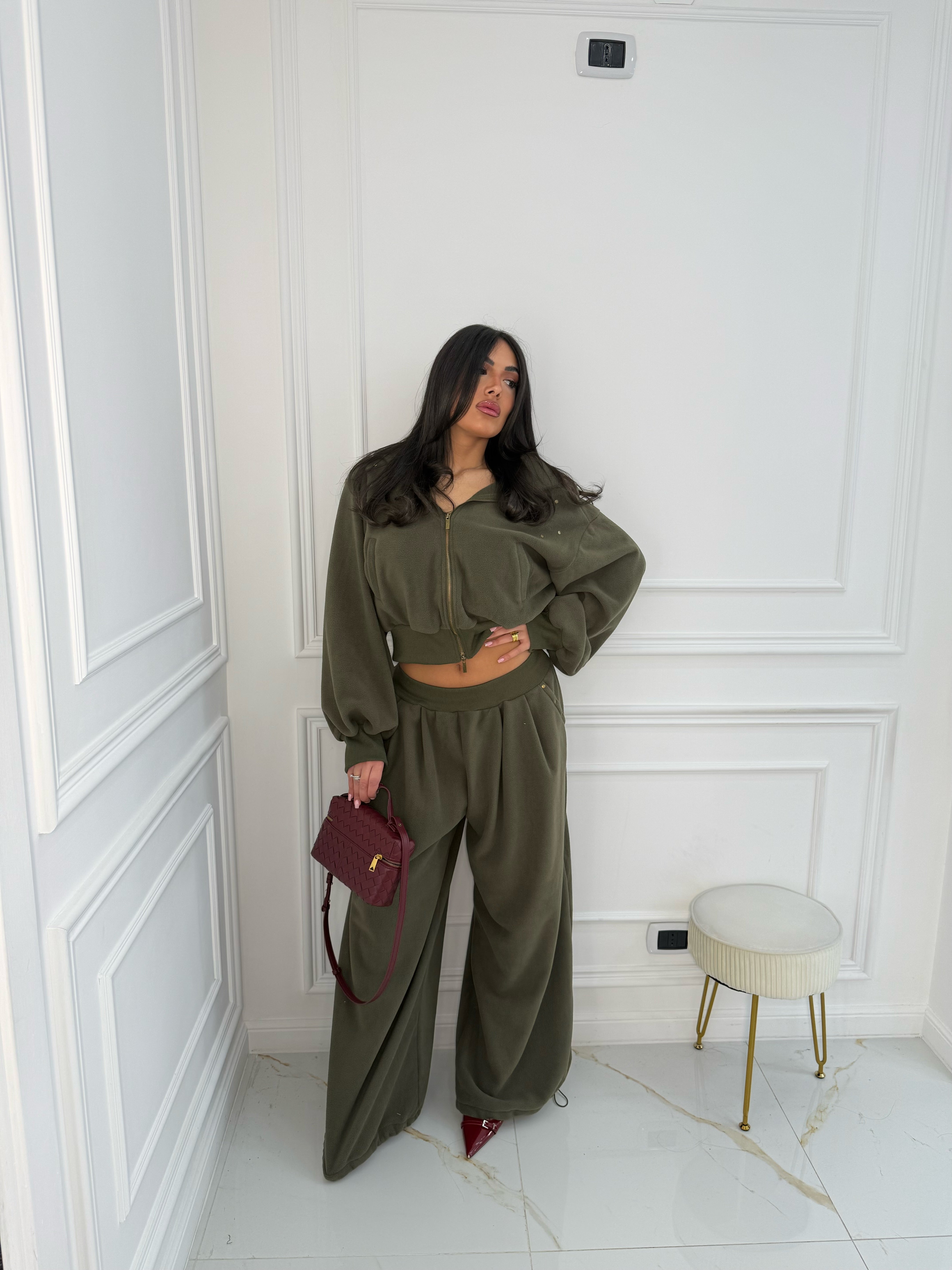 Modello over, pantalone con coulisse sotto per stringere, la modella indossa SM, differenza tra le due taglie minima