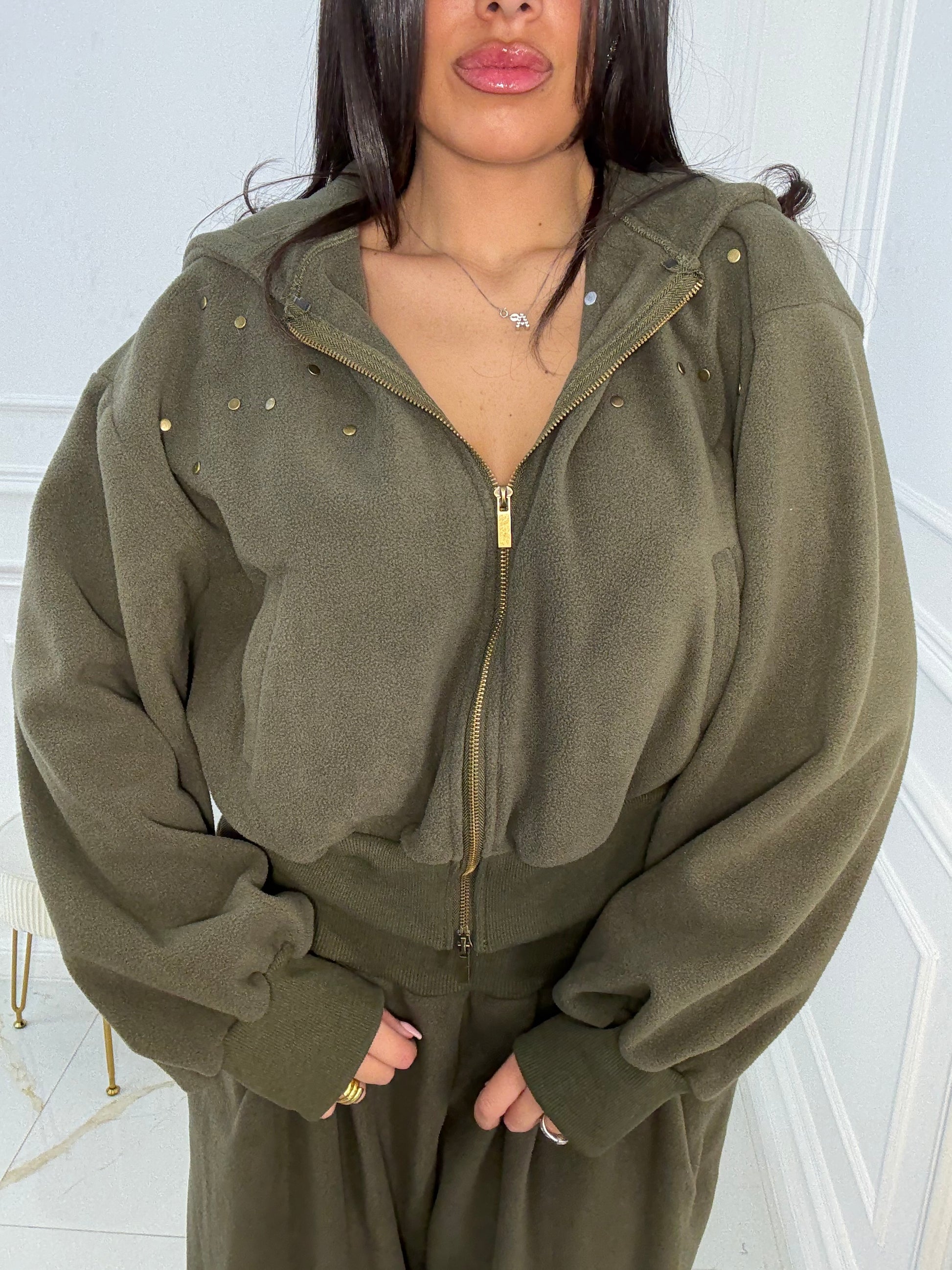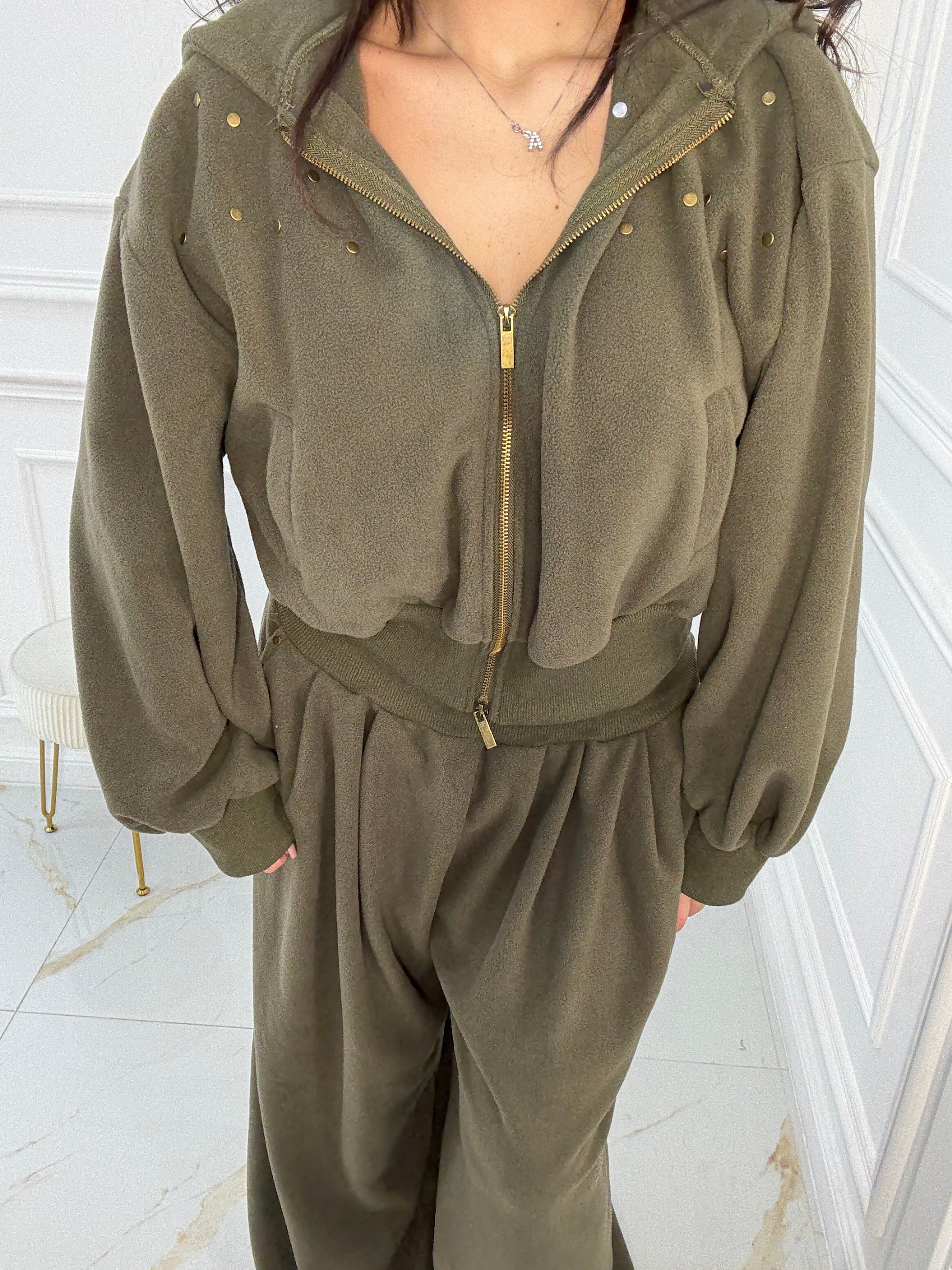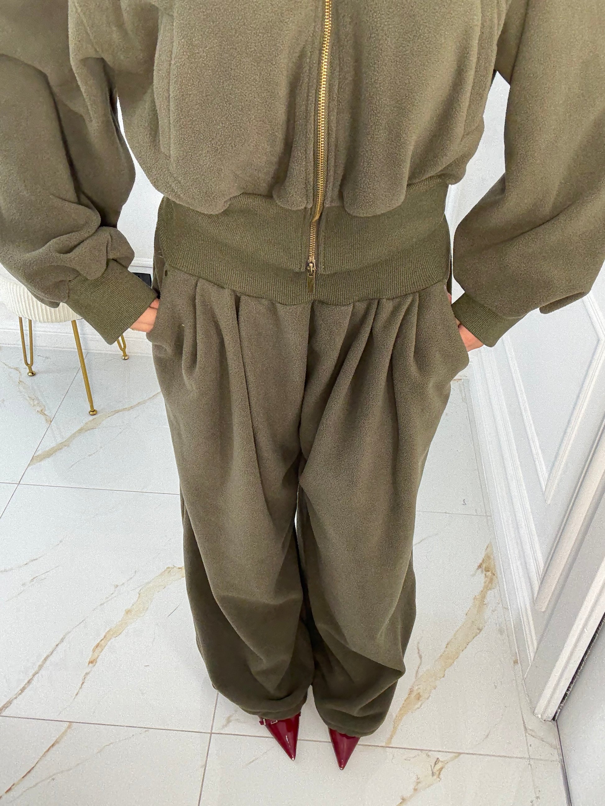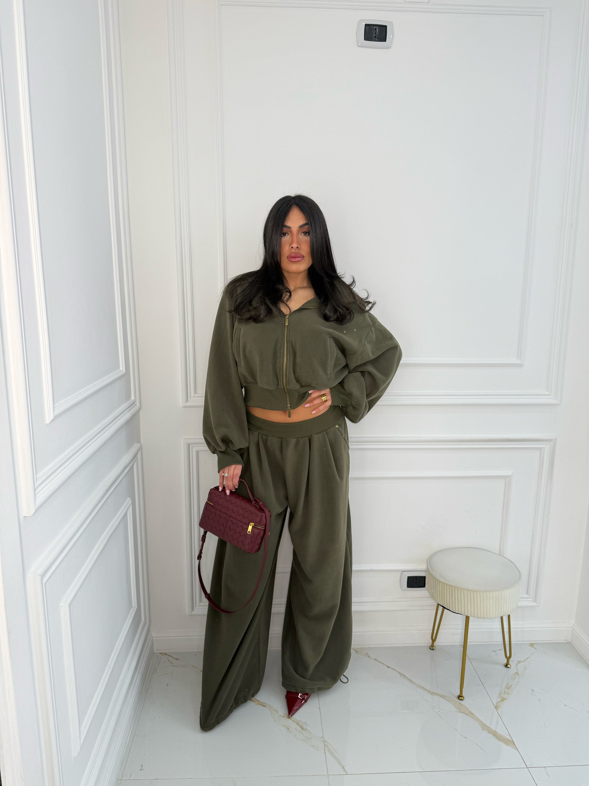 Modello over, pantalone con coulisse sotto per stringere, la modella indossa SM, differenza tra le due taglie minima